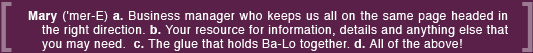 It is said, that behind every great man…well, we know that isn’t the way it is at Ba-Lo Consulting. Working side-by-side with Marcy is the incredible Mary Warner. Mary is the glue that keeps it all together. Our clients may know Mary as the travel guru, business manager and details maven. In fact, she is all that and more.